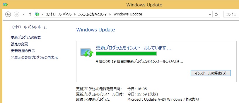 4個のうち19個目の更新プログラムをインストールしています・・。